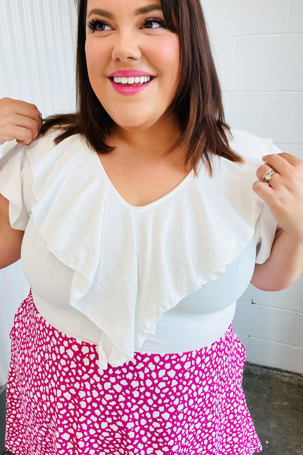 Fuchsia Leopard Two Fer Ruffle V Neck Woven Dress