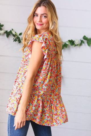 Sumptuous In Smocked Green & Coral Flower Print Babydoll Top
