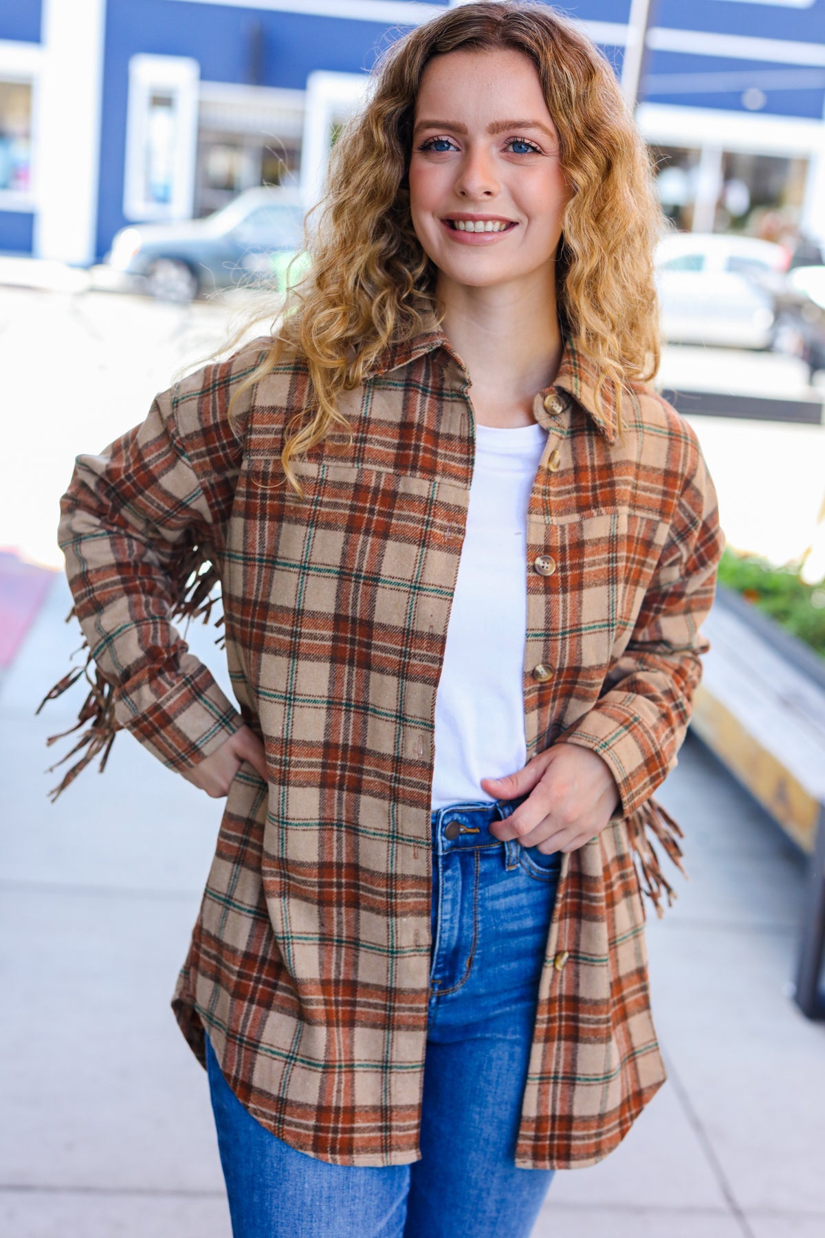 Boldly You Taupe & Rust Flannel Plaid Fringe Jacket