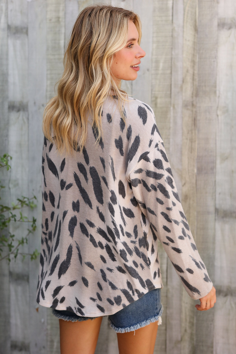 This button-up has the perfect mix of casual and a little sass. The soft beige fabric is covered in a black abstract spot print, and we are loving the contrast with the taupe ribbed collar and pocket. It’s a relaxed fit so you can wear it loose with jeans or even tie the front for a different look. The material is super cozy and easy to throw on for work, lunch with friends, or just running around town.