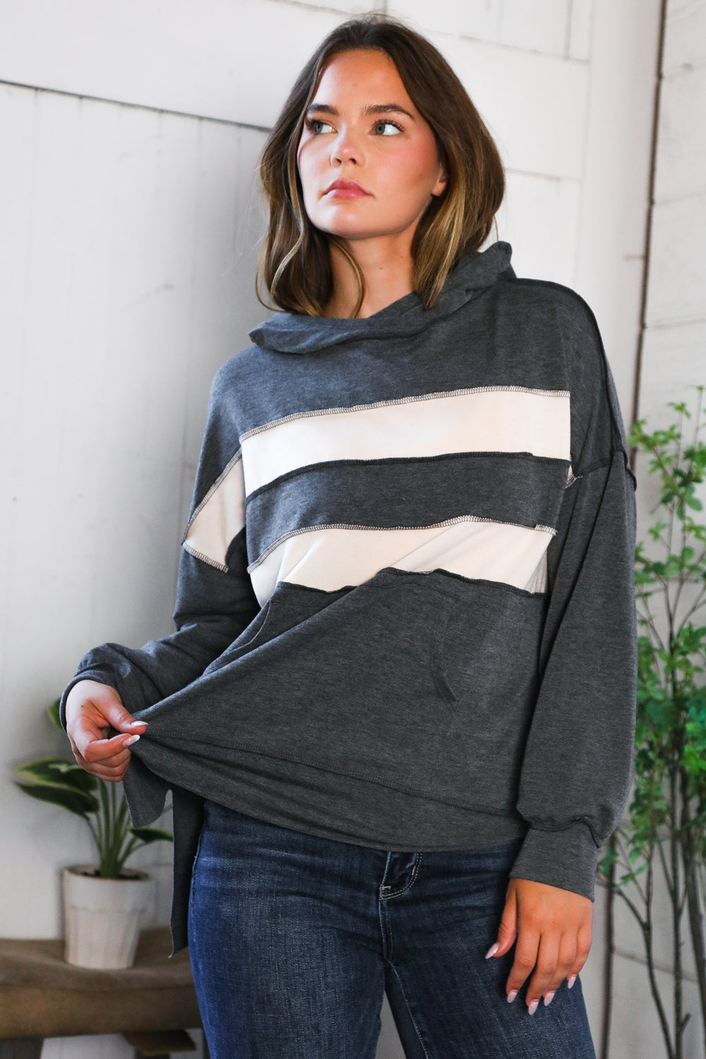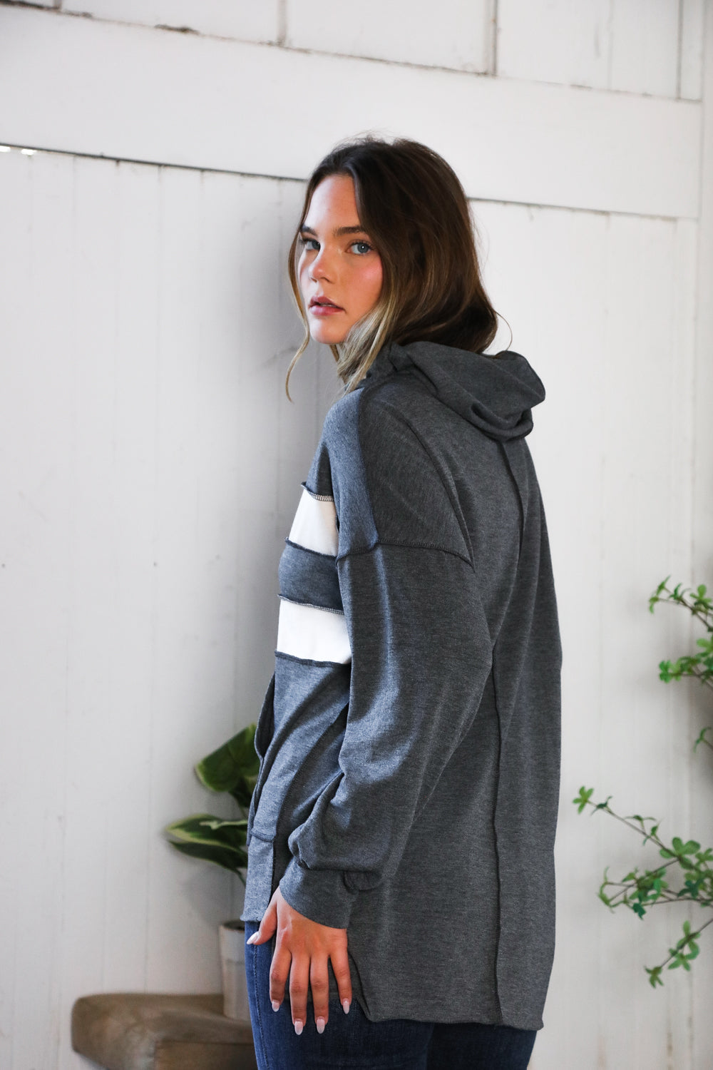 This hoodie is one of those pieces you end up wearing all the time. It’s got that soft charcoal gray fabric with two cream stripes across the chest that give it a fun sporty vibe. The fit is relaxed but not sloppy, with a front pocket to keep your hands warm or toss in your phone. We love that the hem is a little longer in the back for extra coverage and the reverse seam detail gives it that lived in feel. Perfect for throwing on with your favorite jeans for running errands or school drop off on chilly mornings.