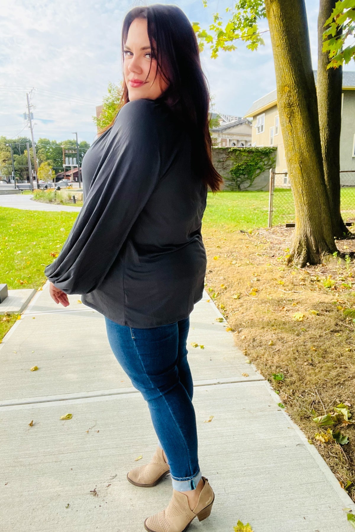 Make a fashion statement this fall while staying cozy in this super soft modal knit peasant top with front tie strings. With long elastic bubble sleeves, pare with a jean jacket for autumn.